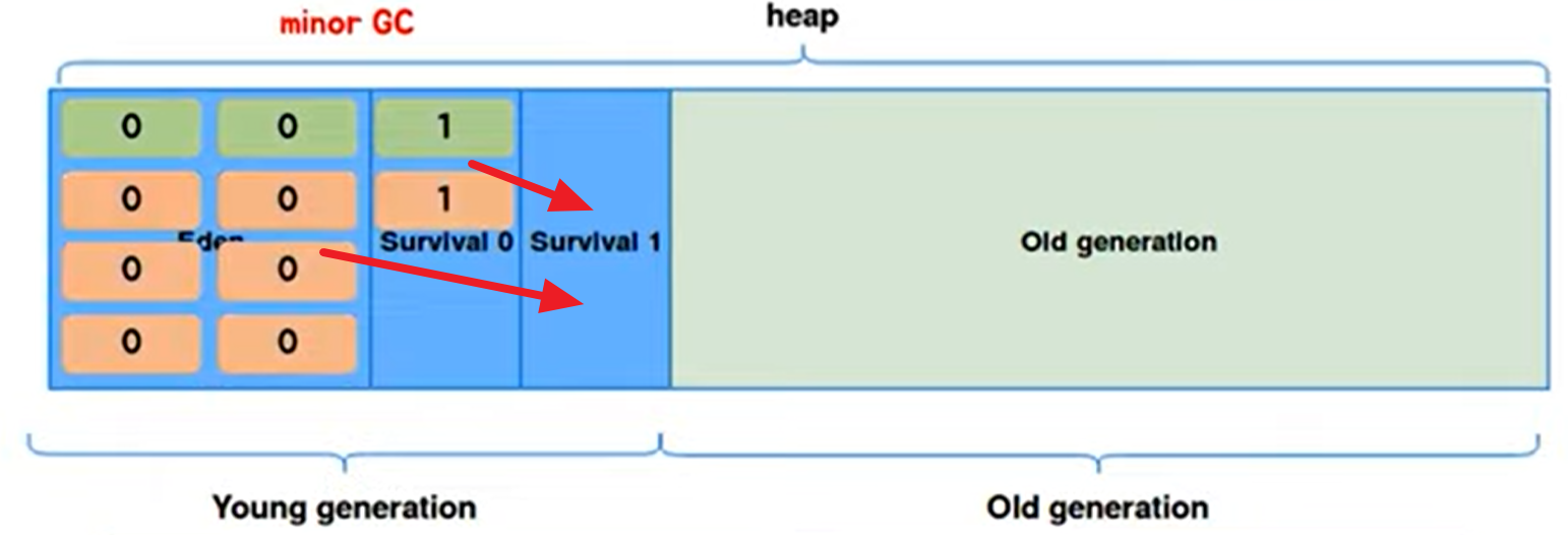 Mark and Sweep 알고리즘에 따라 Young(Eden+Servivor) 영역에 있는 객체들 중 사용되지 않는 객체의 메모리는 해제되고 사용되는 객체는 비어있는 Survivor 영역으로 이동, 해당 객체의 age-bit가 1씩 증가한다. 이 과정을 계속 반복한다.
